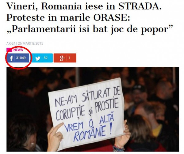 Trei saptamani dupa aceea, cand teoretic furia oamenilor trebuia sa se mai domoleasca, cineva a regasit stirea si i-a dat din nou „share”. Si iar s-a creat o avalansa. Nu mai era de actualitate, insa importante au fost probabil mesajul si imaginea asociata, in care o tanara poarta o pancarta cu „Ne-am saturat de coruptie si prostie, vrem o alta Romanie„. Si iata ca o stire veche a devenit din nou virala, inregistrand un plus de peste 10.000 de „share”-uri. In total, peste 30.000 de oameni au distribuit acest mesaj, chemandu-si semenii in strada. Cred ca este un record in presa online.