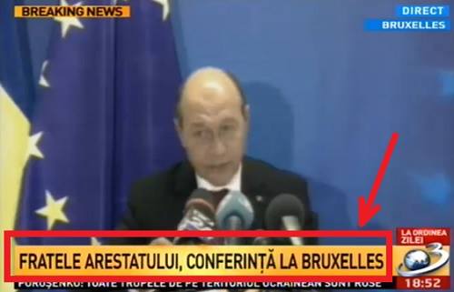 Reamintim că Antena 3 a ales aseară un mod incalificabil de titra transmisiunea în direct a declarației de presă a președintelui Băsescu aflat la Consiliul European de la Bruxelles. Pe durata întregii transmisiuni, producătorii au ales să țină pe ecran această burtieră: „Fratele arestatului, conferință la Bruxelles”.