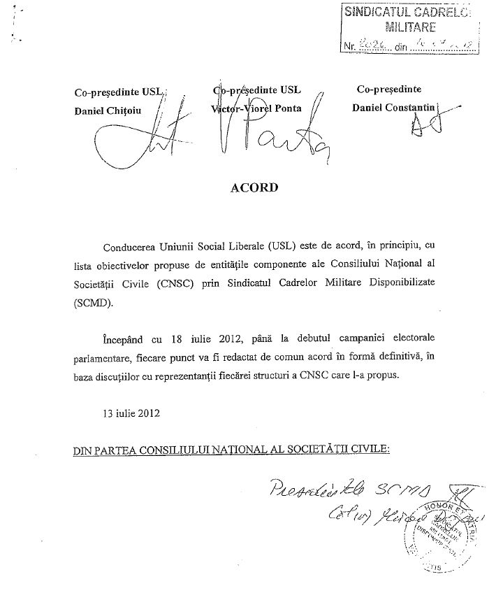 Documentul incheiat intre USL si Sindicatul Cadrelor Militare Disponibilizate a fost semnat pe 13 iulie 2012 si stabileste lista obiectivelor comune. Ponta, Chitoiu si Constantin si-au dat acordul pentru desfiintarea celor mai importante institutii de lupta impotriva coruptiei: Directia Nationala Anticoruptie, Agentia Nationala de integritate, Consiliul National de Studiere a Arhivelor Securitatii si Curtea Constitutionala.
