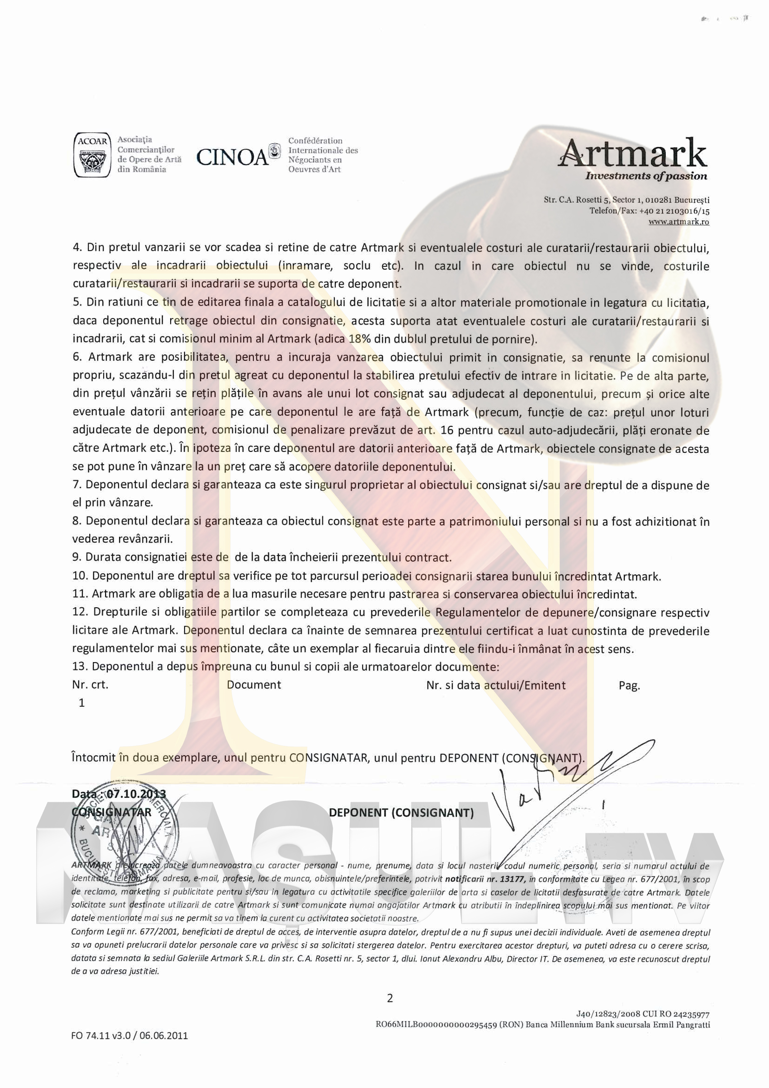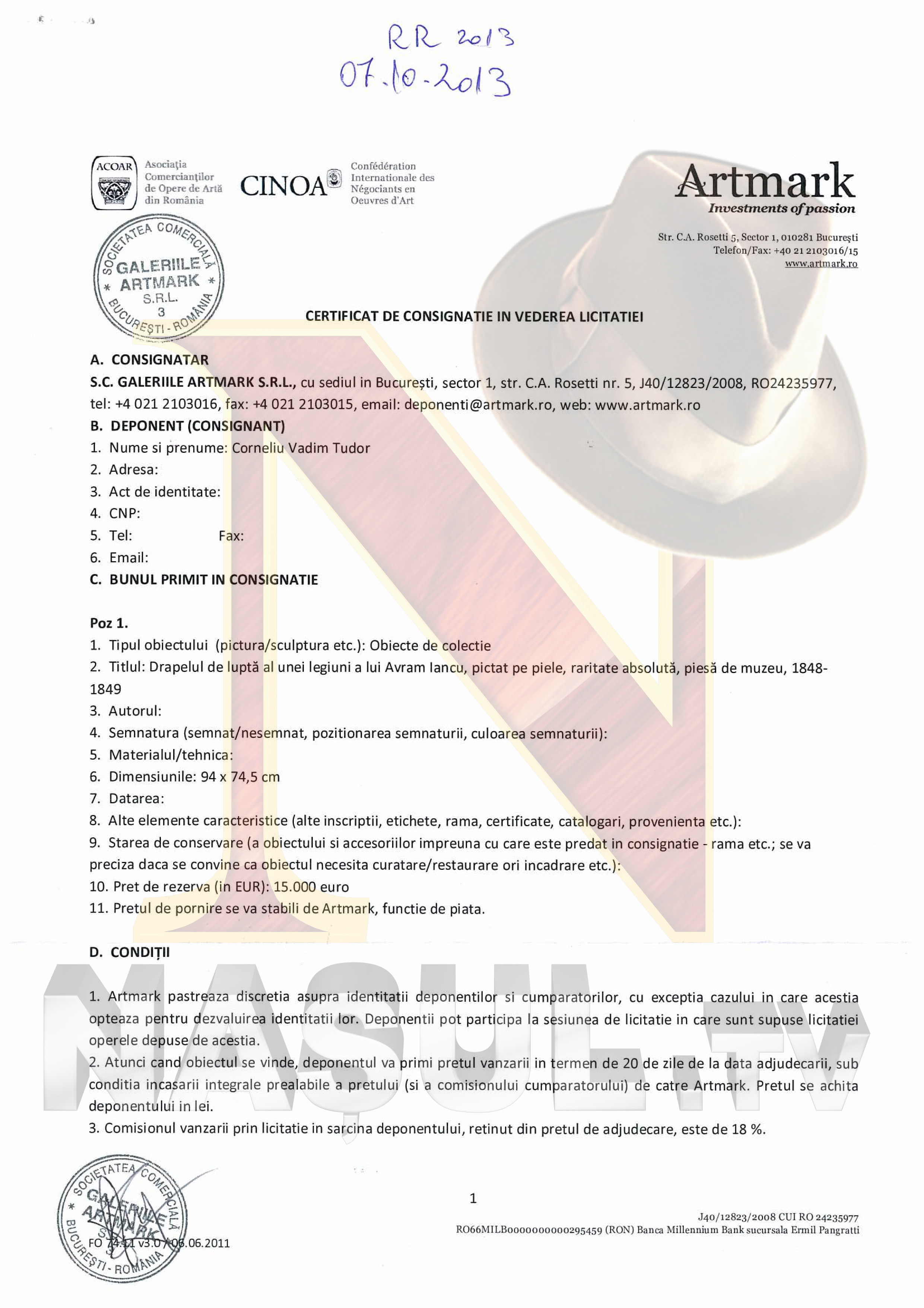 Nasul Tv a obtinut documentul care dovedeste ca steagul de lupta al lui Avram Iancu ii apartine lui Corneliu Vadim Tudor si ca acesta l-a dat in consignatie in vederea licitatiei catre Galeriile Artmark, pentru suma de 15.000 de euro. Marti, Vadim a declarat ca nu a vandut drapelul si a precizat ca si daca l-ar fi vandut este strict problema sa, fiind un obiect din colectia personala.