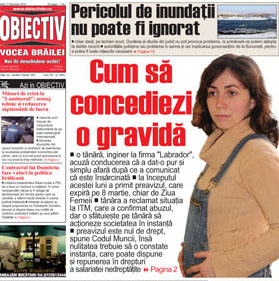 “O tânără salariată a SC „Labrador Trade” se plânge că a primit preaviz de concediere după ce şi-a anunţat angajatorul că este gravidă, iar asta deşi Codul Muncii interzice în mod expres concedierea gravidelor. Femeia povesteşte că imediat după ce a anunţat că aşteaptă un copil a văzut o cu totul altă faţă a angajatorului, cu care nu mai avusese vreun conflict. S-a ajuns până la solicitarea intervenţiei Poliţiei, pentru a calma spiritele după ce a fost îmbrâncită şi dată afară din unitate. Supărată peste măsură de cele întâmplate, tânăra a sesizat Inspectoratul Teritorial de Muncă Brăila cu privire la cazul său, ocazie cu care a semnalat şi toate neregulile pe parte de legislaţia muncii, pe care susţine că le-ar fi săvârşit patronii săi. Acum, femeia vrea să acţioneze în instanţă conducerea firmei pentru a i se face dreptate. Şi dreptate i se va face!, spune şi inspectorul şef al ITM Brăila, Dumitru Văduva, confirmând că este vorba despre un abuz pe care instanţa îl va îndrepta fără probleme.