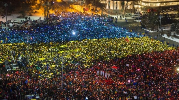 În Piaţa Victoriei din Bucureşti, unde în urmă cu două săptămâni manifestanţii au realizat tricolorul, duminică este programată, de la ora 21.00, „Operaţiunea steagul UE”.