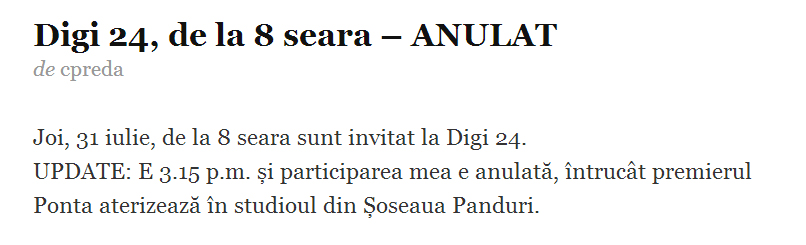 „Joi, 31 iulie, de la 8 seara sunt invitat la Digi 24. UPDATE: E 3.15 p.m. și participarea mea e anulată, întrucât premierul Ponta aterizează în studioul din Șoseaua Panduri”, a scris Cristian Preda pe blog, după ce postul patronat de Zoltan Teszari şi condus de „deontologul” Cosmin Prelipceanu i-a anulat invitaţia pentru a răspunde solicitării premierului Victor Ponta.