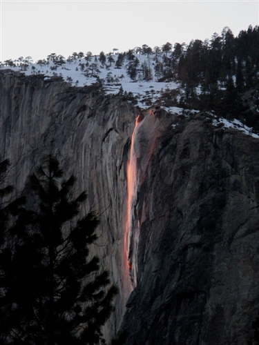 In parcul national Yosemite din SUA, o cascada ofera privelistea unei caderi de „apa de foc”. Fenomenul natural se produce la rasarit, cand soarele creeaza iluzia unei ploi de foc, proiectand o lumina rosie asupra apei ce cade in cascada.