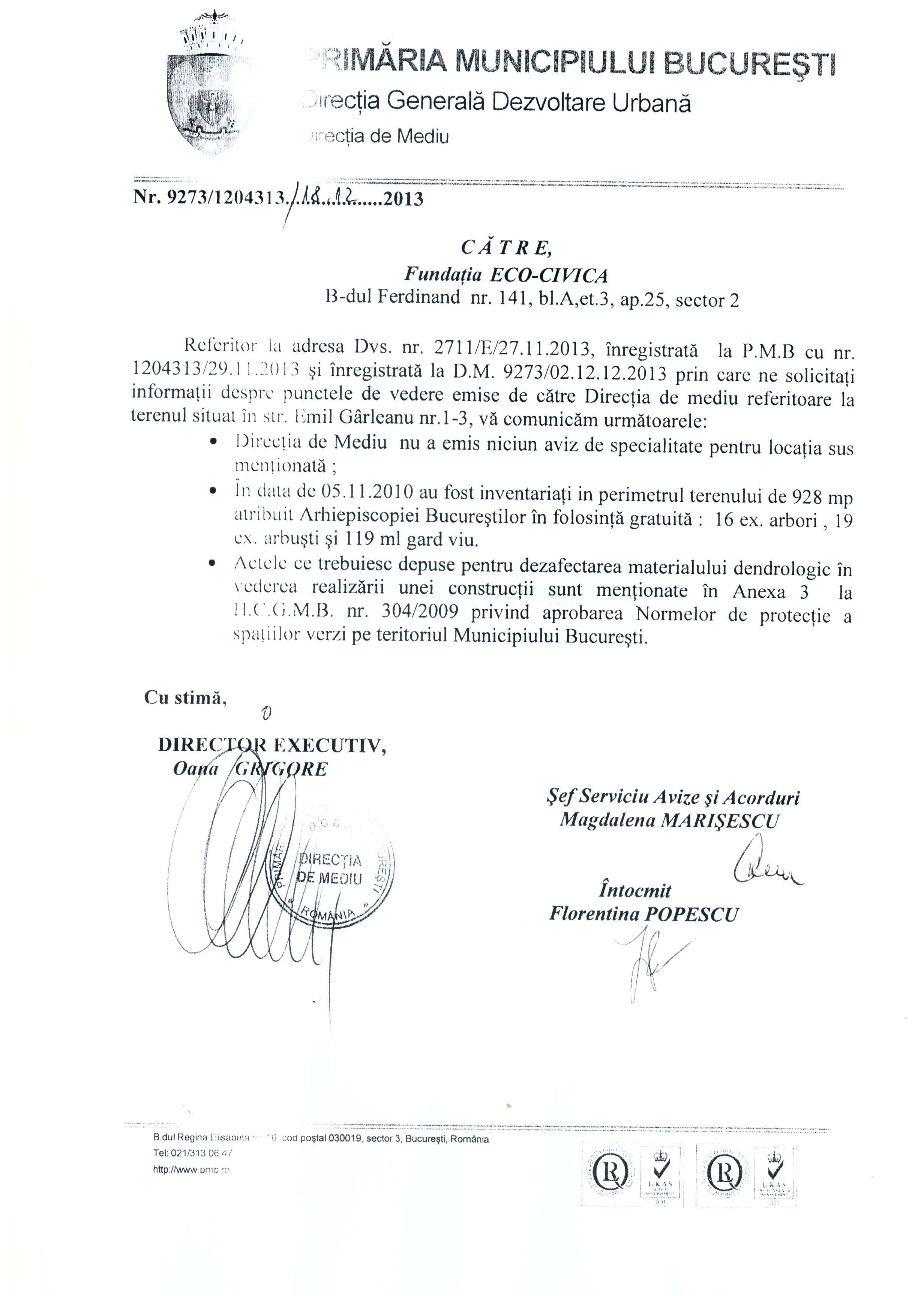 In urma actiunii unor necunoscuti de a defrisa terenul BOR-ului, la cererea Fundatiei Eco-Civica, Directia Dezvoltare Urbana a Primariei Municipiului Bucuresti a raspuns unei adrese oficiale prin care anunta ca Directia de Mediu nu a emis niciun aviz pentru terenul respectiv.