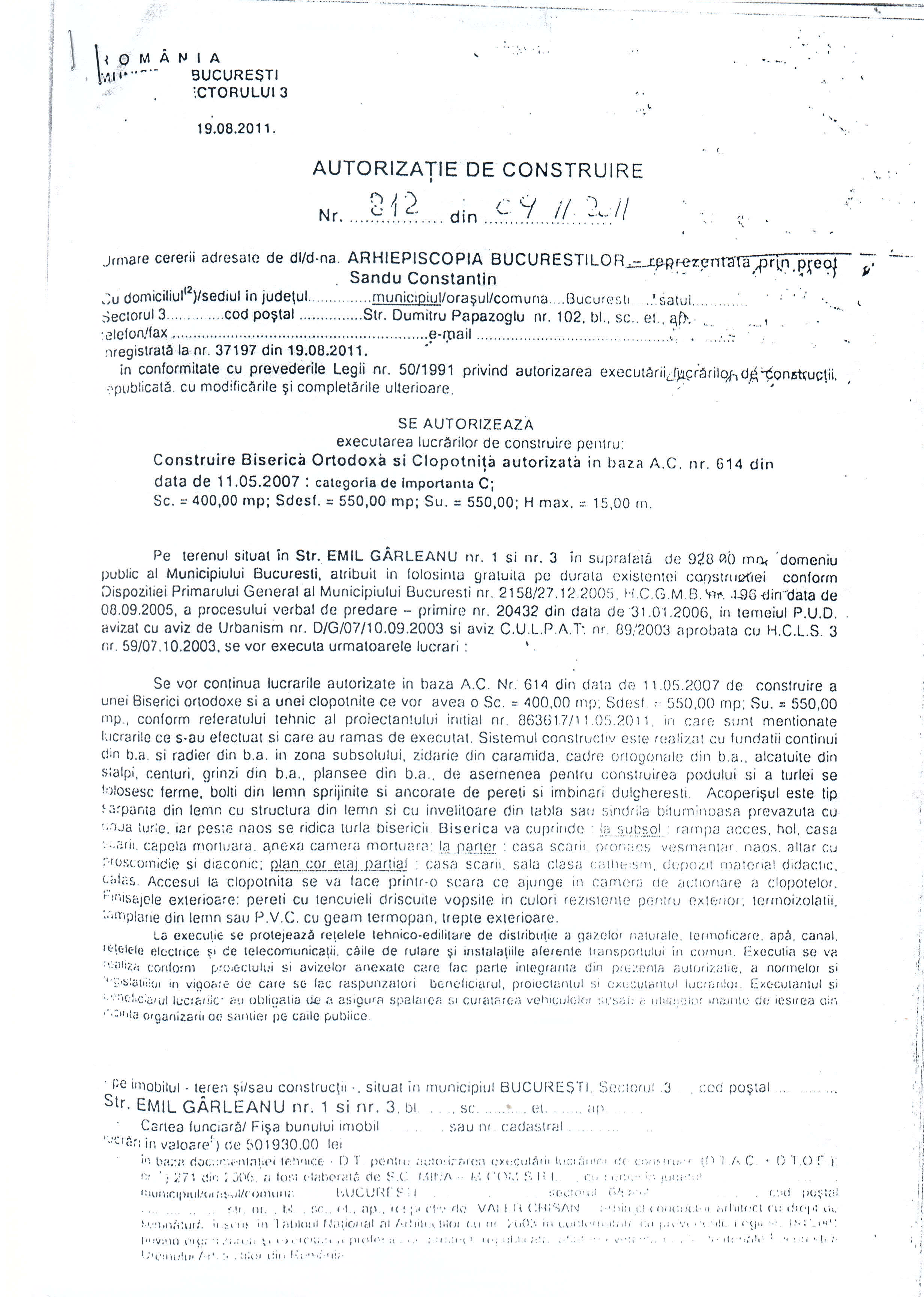 Primaria a emis cea de-a doua autorizatie netinand cont ca cea emisa in 2007 a expirat, proiectul este total schimbat iar Episcopia Bucurestilor ne mai este reprezentata de preotul Sandu Constantin.