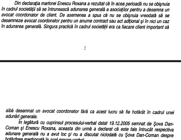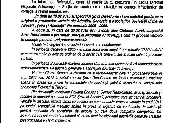 ”La fila 19 din actul de sesizare al Parlamentului, domnul procuror a precizat că <<Din declaraţiile martorilor Ciurcu Simona şi Brîncuş Alin Aurel Nicolae persoane angajate în cadrul SCA ”Şova şi Asociaţii” a rezultat faptul că în anul 2010, din dispoziţia suspectului Şova Dan Coman, s-au distrus toate hardurile calculatoarelor societăţii de avocaţi cu scopul de a compromite toate documentele şi corespondenţa purtată pe mail între societatea de avocaţi şi conducerile celor două complexe energetice>>. Primul lucru pe care vreau să-l subliniez este faptul că declaraţia privind distrugerea hard-urilor îi aparţine numai domnului Alin Brîncuş. Doamna Simona Ciurcu spune foarte clar că ei i-a povestit domnul Alin Brîncuş despre distrugerea hard-urilor. La dosarul cauzei, Alin Brîncuş afirmă, în declaraţia domnie sale, că a distrus hard-urile cu unul dintre şoferi pe care-l cheamă Chişavu Ranetti Victor. Problema este că avem şi declaraţia domnului Chişavu Ranneti Victor, singurul care ar fi putut confirma ceea ce spune domnul Brîncuş, care afirmă foarte clar că nu a participat niciodată la nicio distrugere de hard-uri, nu le-a aruncat în niciun lac şi nu a făcut aşa ceva cu domnul Brîncuş”.