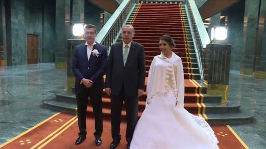 Imaginile difuzate de Preşedinţia Turciei şi de site-ul de ştiri Haberturk.com îl arată pe Recep Tayyip Erdogan întâmpinându-i pe cei doi miri şi oferindu-i miresei o brăţară. Preşedintele Turciei i-a felicitat pe cei doi tineri care s-au căsătorit sâmbătă.