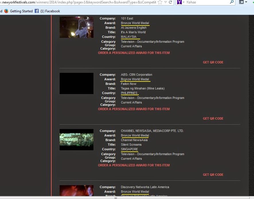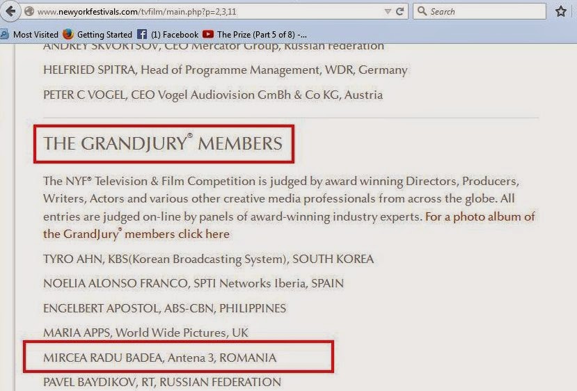 In 2014, ANTENA3, la categoria „Current affairs”, unde a luat „Gold” adica „Aur” cu materialul „The long jurney home”, tot „Aur” au luat si alte doua televiziuni din Malaezia si Suedia. Adica festivalul e darnic in a da premii, deci Antena3 nu e singura cea mai tare! La argint premiile au fost acordate tot in numar de trei, iar la categoria bronz au fost nu mai putin de 4(patru) premii. La categoria „Investigative report” 2 televiziuni au luat „Aur”, alte 5 premii au fost de „Argint”, printre care unul luat de Antena3. Una din televiziuni luand nu mai putin de 3 premii de argint la aceasta categorie. La categoria „Biography/profiles” unde Antena3 a mai luat o medalie de „Aur”, tot aceleasi medalii de aur le-au mai luat alte doua televiziuni. Asadar trei medalii de aur la aceeasi categorie. La „Best investigative report” au existat 2 premii de „Aur”, Antena 3 a luat unul de „Argint” impreuna cu alte 2 televiziuni, iar la categoria „Bronz” nu a existat niciun premiu. La categori „Best News Documentary/Special” unde Antena3 a luat „Aur” au fost doar 3 materiale participante, din care Antena3 si inca o televiziune au luat „Aurul” si cealalta „Argintul”. Bronzul nu l-au mai dat la nimeni ca nu aveau cui! Cu siguranta ca premiile luate si in 2015 vor fi anuntate cu surle si trambite la o ora de maxima audienta de nimeni altul decat pastorul si directorul Antenei 3 Gadea Mihai.