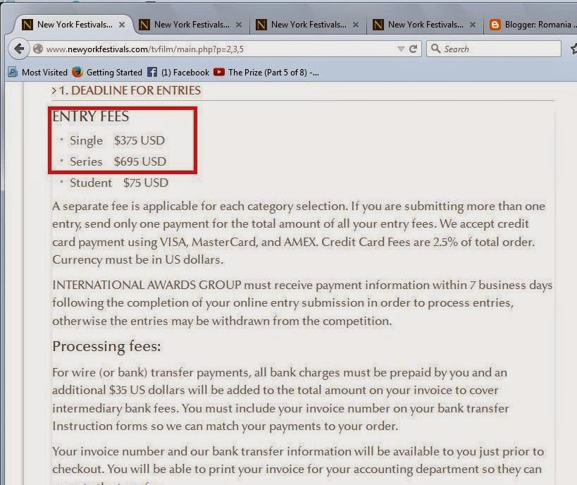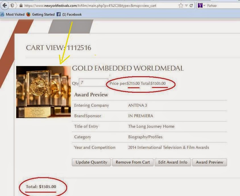 Conform sitului festivalului, in 2014 doar trofeele Antenei 3 au costat cam 1,500 de dolari, adica 215 dolari bucata, la care se mai adauga, conform regulamentului de participare, alti 3,690 de dolari taxa initiala de inregistrare a materialelor. Iar daca mai vorbim si de costul biletelor de avion, cazare, masa etc…pentru toata trupa prezenta in America, vorbim de cateva zeci de mii de dolari. „There is no numerical limit of the number of finalists in any category. Each entry is, in effect, in competition with itself….. One, none, or more than one medal may be given in any category.” New York Festivals.