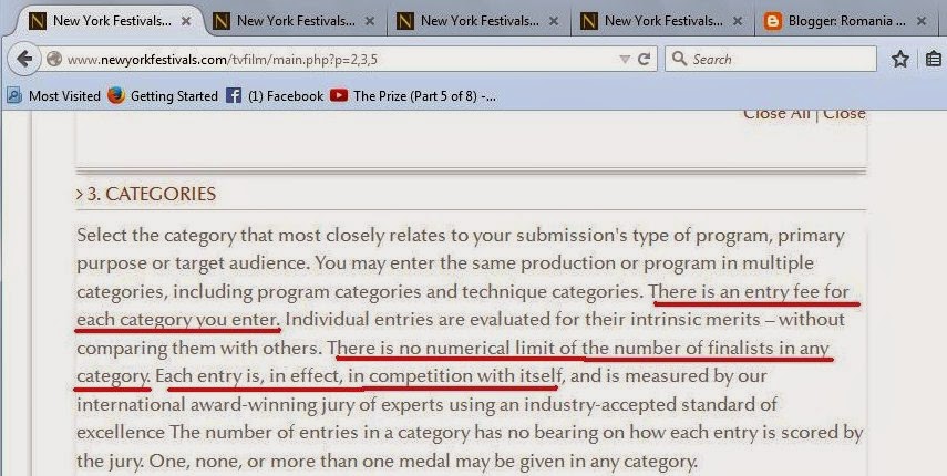 Regulamentul celor de la New York Festivals arata ca in festival pot exista un numar nelimitat de finalisti la fiecare categorie, fara sa existe o competitie reala intre materialele celorlalte televiziuni participante (contrar incearcarilor Antenei 3 de a manipula publicul). Acestia pot oferi una, mai multe sau nicio medalie la aceeasi categorie. Festivalul are o asa diversitatea de categorii in care poti sa te inscri cu materiale, daca ai banii, incat sansele sa fi premiat sunt aproape garantate, mai ales ca nu ai concurenta.