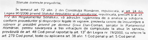 Potrivit documentului obținut de EVZ, în solicitarea formulată de Ministerul Justiției, pe lângă cele două articole menționate de Parchetul General, apare un nou articol, respectiv art. 24 din Legea 96/2006, care, la art. 4, prevede: „Camera hotărăște asupra cererii cu votul secret al majoritătii membrilor săi”. „Senatul a luat în dezbatere și s-a pronunțat prin vot asupra cererii de ridicare a imunității unui senator, fără depășirea limitelor acestei competențe și exact în baza temeiurilor legale menționate de solicitant în cererea sa, respectiv, art. 24 din Legea 96/2006 și art.172 din regulamentul Senatului”, explica Tăriceanu după votul în cazul Șova.