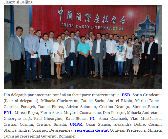 O delegaţie compusă din 29 de parlamentari PSD, PNL, PC, UNPR, a vizitat, luni, Radio China Internaţional (RCI), unde a fost primită de directorul general adjunct Xia Jixuan şi de directorul secţiei de limbă română Wu Min. Delegaţia parlamentară, aflată în China în perioada 9 – 17 septembrie, la invitaţia Secţiei petru Relaţiile Internaţionale a Comitetului Central al Partidului Comunist Chinez, a avut program de vizite şi întâlniri la Shanghai, Jianxu şi Beijing, anunța Radio China în septembrie 2013.