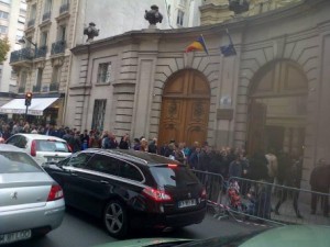 Maria, o romanca de la Paris ne-a transmis un filmulet complet al evenimentelor petrecute duminica 2 noiembrie 2014, in primul tur de scrutin, la sectia de votare de la Ambasada Romaniei. Veti vedea cum s-au inchis usile Ambasadei la ora 20.30, interventia jandarmilor francezi din jurul orei 21, dar si reactia de revolta pasnica a romanilor care nu au reusit sa-si exercite dreptul la vot. De asemenea, Maria ne trimite si o copie a scrisorii deschise intocmita de presedintele unui ONG din Franta (Utopia) catre ministrul francez al afacerilor externe in care se vorbeste despre abuzurile din duminica trecuta. Imagini pe www.hotinfo.ro!