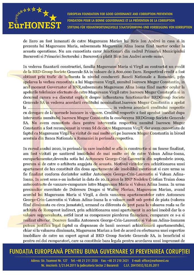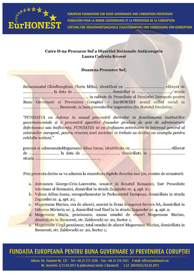 Alina Măgureanu a depus un denunţ penal la DNA, semnat împreună cu Florin Ghiulbenghian, preşedintele Fundaţiei Europene pentru Bună Guvernare şi Prevenirea Corupţiei – EurHONEST, în care îi acuză pe politicienii Crin Antonescu, Adina Vălean, Virgil Măgureanu, Mugur Isărescu, Andrei Chiliman şi Sorin Oprescu, şi pe oamenii de afaceri Florian Walter, Dragoş Dobrescu, Ion Andrei Biriş, Marian Măgureanu, de acte de corupţie extrem de grave care atentează la valori morale fundamentale.
