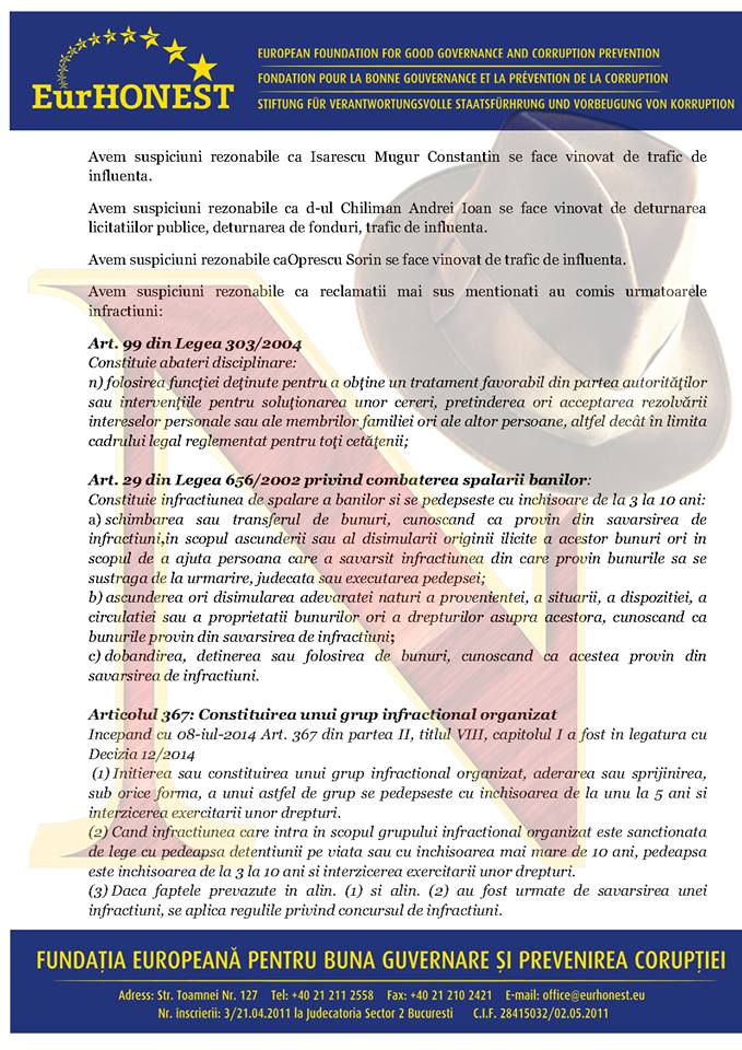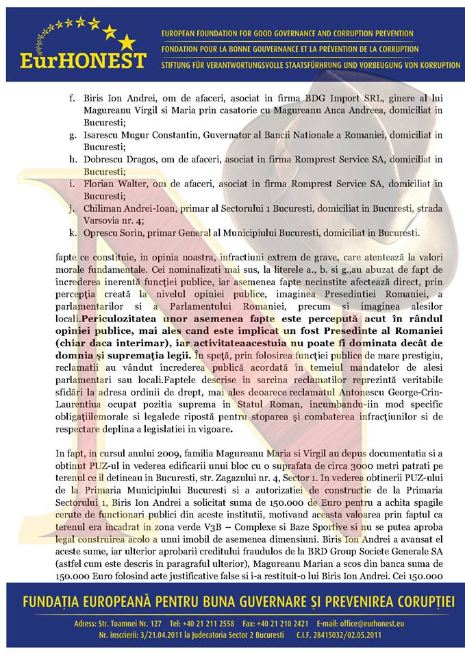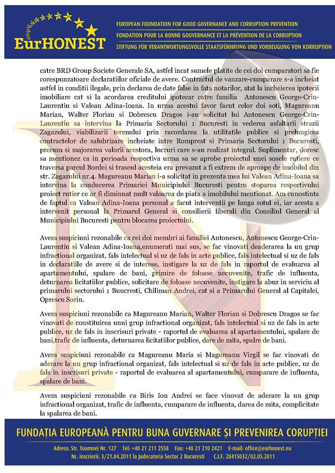 Potrivit denunţului „prin folosirea funcţiei publice de mare prestigiu, reclamaţii au vândut încrederea publică acordată în temeiul mandatelor de aleşi parlamentari sau locali. Faptele descrise în sarcina reclamaţilor reprezintă veritabile sfidări la adresa ordinii de drept, mai ales deoarece reclamatul Antonescu George-Crin-Laurenţiu a ocupat poziţia supremă în Statul Român, incumbându-i în mod specific obligaţiile morale şi legale de ripostă pentru stoparea şi combaterea infracţiunilor şi de respectare deplină a legislaţiei în vigoare”.