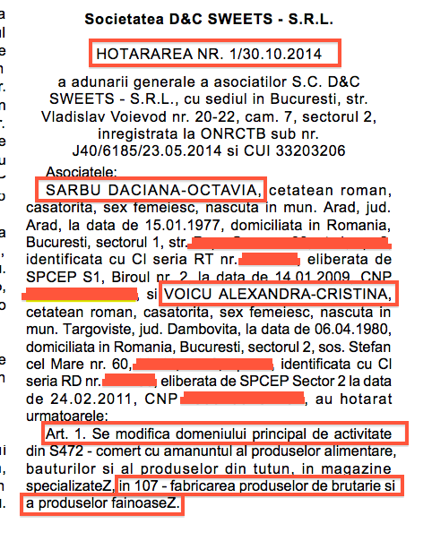 Monitorul oficial nr. 1060 (partea a IV-a) din 27 februarie a.c. menționează că firma D&C SWEETS SRL, deținută (și) de Daciana-Octavia Sârbu, și-a schimbat domeniul principal de activitate. Conform documentului invocat, “Se modifică domeniul principal de activitate din 472 – comerț cu amănuntul al produselor alimentare, băuturilor și al produselor din tutun, în magazine specializate, ÎN 107 – FABRICAREA PRODUSELOR DE BRUTĂRIE ȘI A PRODUSELOR FĂINOASE.”