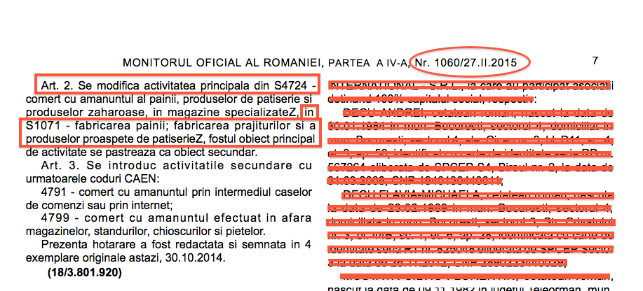 – schimbarea obiectului de activitate al firmei Dacianei s-a întîmplat în octombrie 2014, darMonitorul oficial al lui Victor Viorel a înregistrat schimbarea asta abia în februarie 2015, adică vreo patru luni mai tîrziu.