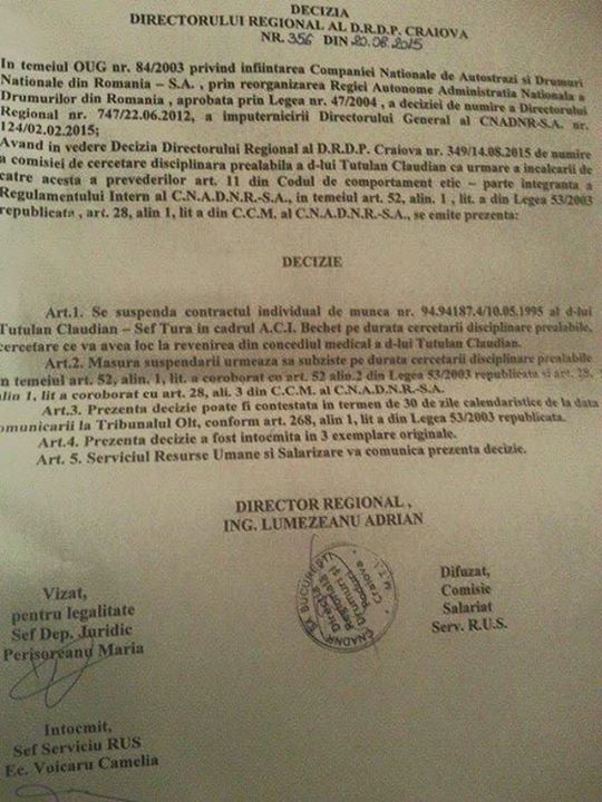 turcescuRobert Turcescu a publicat pe pagina sa de Facebook un document în exclusivitate prin care se dovedește eliminarea din CNADNR a lui Claudin Țuțulan, un alt angajat ale carui dezvaluiri s-au dovedit incomode pentru conducerea Companiei Naționale de Autostrăzi și Drumuri.