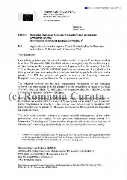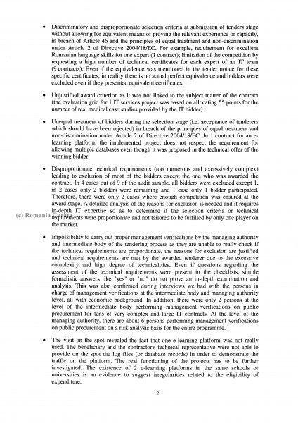 Toate neregulile de mai sus sunt cuprinse într-un document al Comisiei Europene transmis autorităților române la sfârșitul anului trecut (23 decembrie 2014) și care a fost obținut de România Curată de la Bruxelles. Practic, neregulile semnalate în document reprezintă tabloul licitațiilor ”cu dedicație” care au ajuns ”la cine trebuia” prin impunerea unor cerințe care ajutau la scoaterea din competiție a ofertanților nedoriți. Conform documentului, doar în cazul a două contracte de atribuire dintr-un eșantion de 9 contracte verificate ca eșantion se poate vorbi de existența unei concurențe reale. Nemulțumirea inspectorilor care au realizat auditul este cu atât mai mare cu cât, după cum am arătat, necesitatea și/sau calitatea proiectelor finanțate ridică serioase semne de întrebare în condițiile în care serviciile realizate nu sunt utilizate sau nu se poate verifica utilizarea lor.