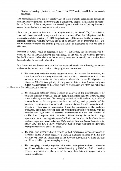 Walter Deffaa, Director-General pe Politici Regionale și Politică Urbană al CE, cel care semnează documentul, a solicitat Guvernului României pași concreți pentru repararea deficiențelor grave din modul cum sunt cheltuite fondurile UE pe proiecte IT în România. Măsurile solicitate: