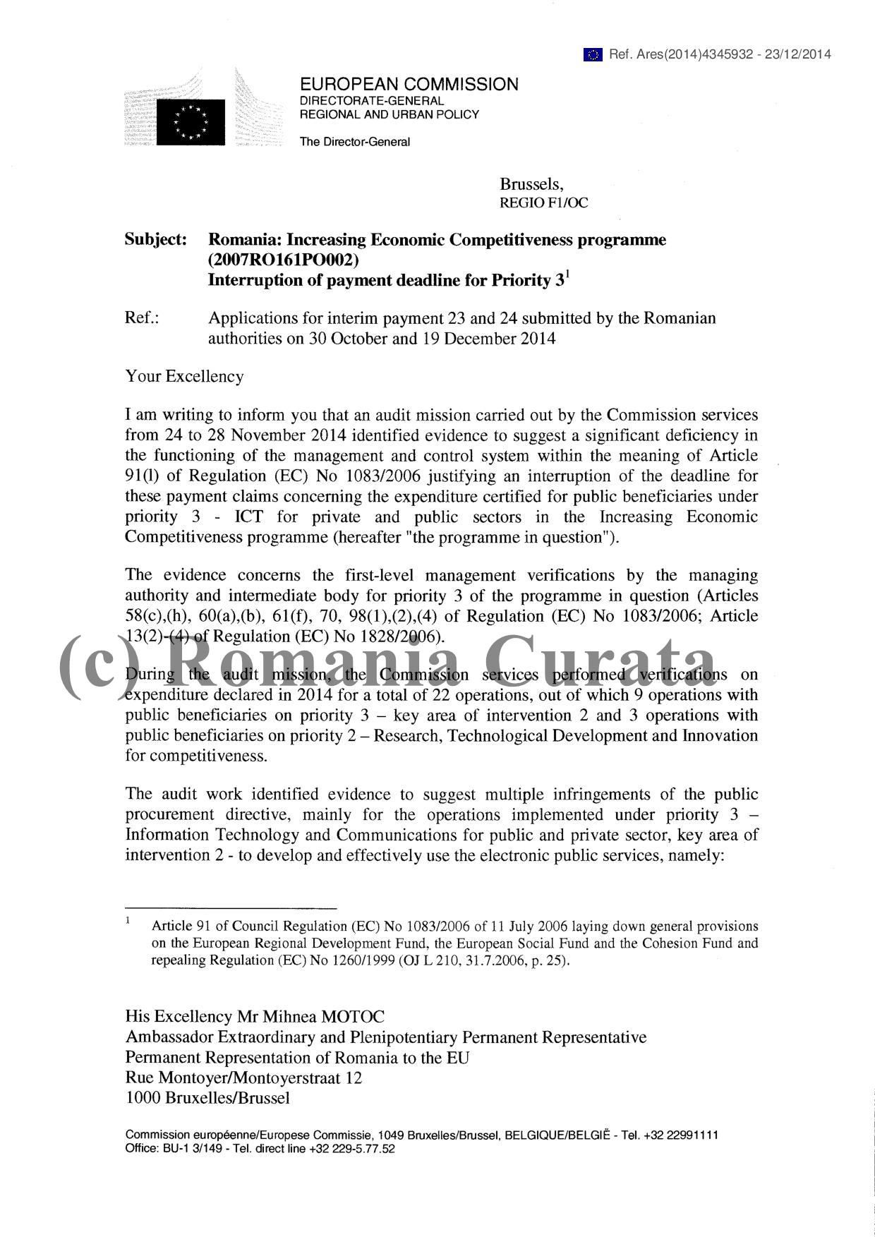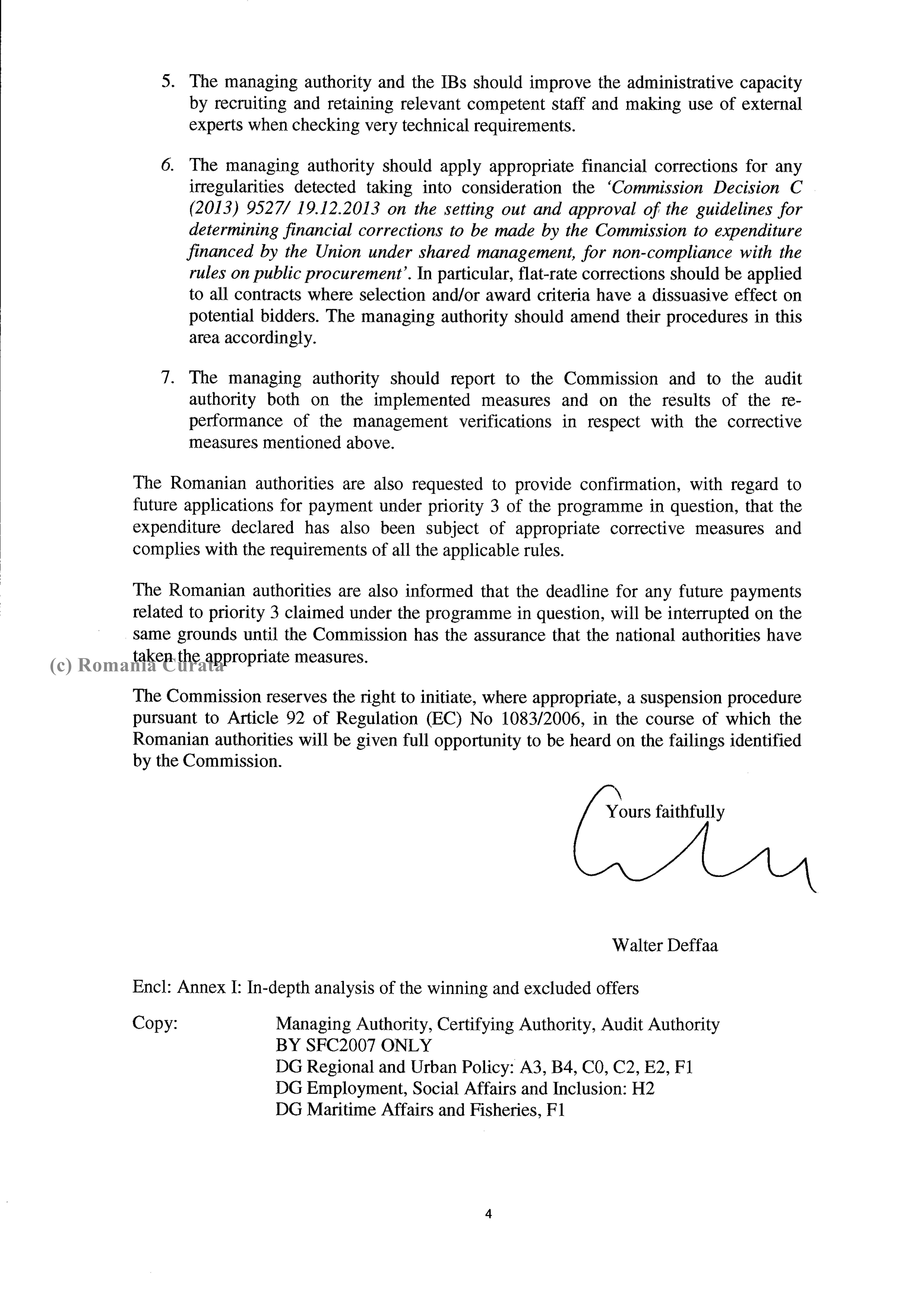 Walter Deffaa, Director-General pe Politici Regionale și Politică Urbană al CE, cel care semnează documentul, a solicitat Guvernului României pași concreți pentru repararea deficiențelor grave din modul cum sunt cheltuite fondurile UE pe proiecte IT în România. Măsurile solicitate: