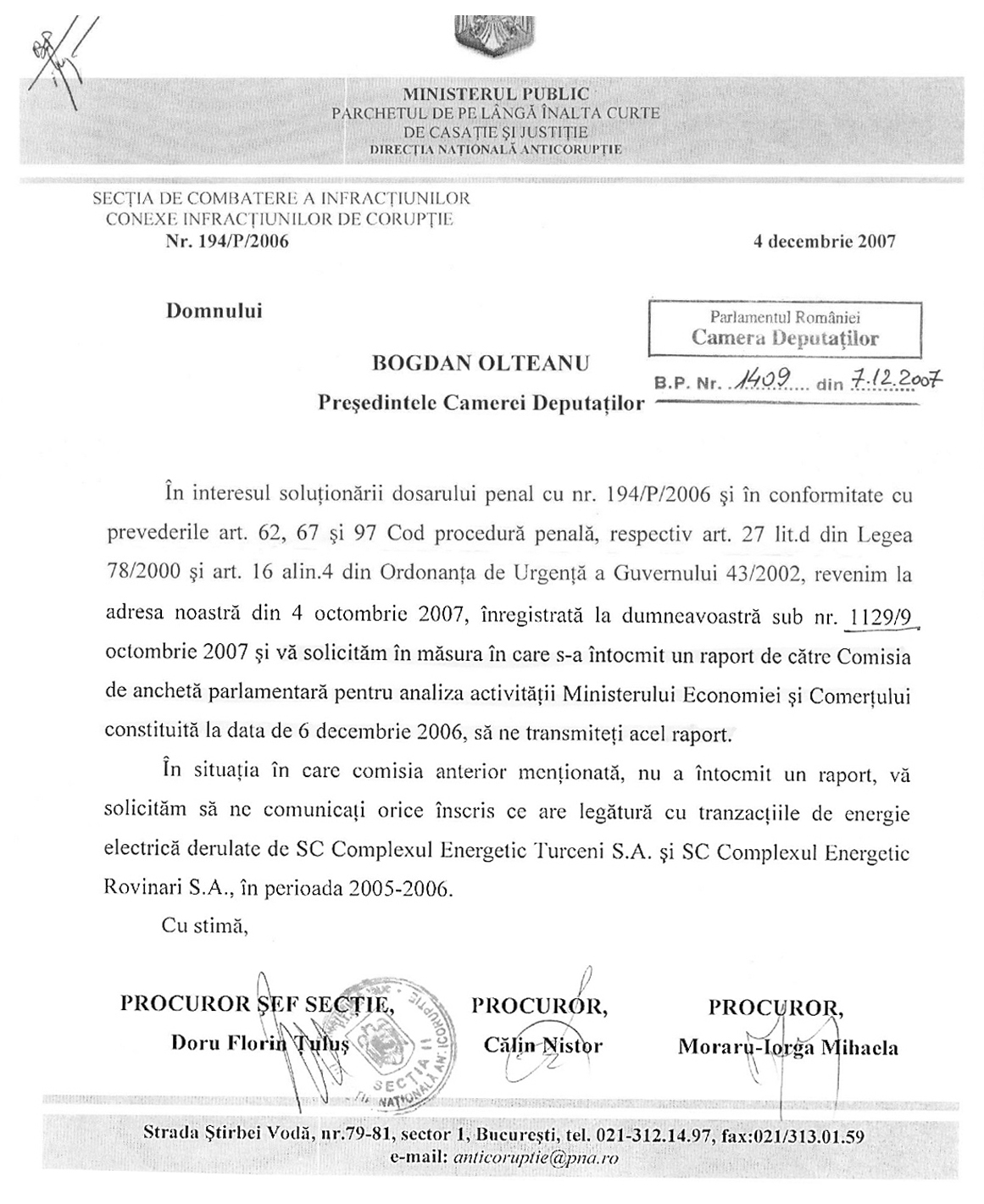 4 decembrie 2007: și DNA îi cere lui Bogdan Olteanu, președintele Camerei Deputaților, date din raportul comisiei de anchetă, cu referire directă la contractele de energie de la Turceni și Rovinari;