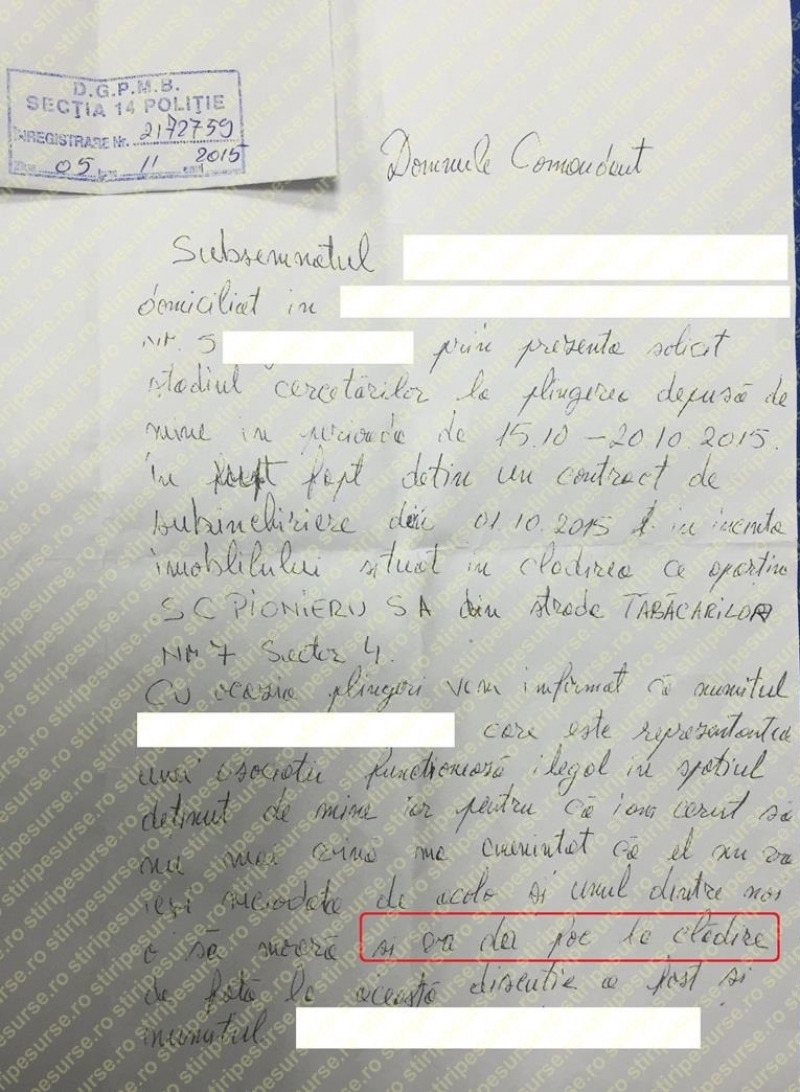 NU sunt povești. Este o plângere depusă la Poliție în acest sens primită și înregistrată ca atare la Secția 14 de Poliție. Cetățeanul care a depus plângerea a revenit azi și le-a cerut socoteală în scris celor de la Poliție după ce a văzut la televizor ce s-a întâmplat acolo. Deocamdată polițiștii nu prea au făcut nimic în cauză potrivit informațiilor noastre.