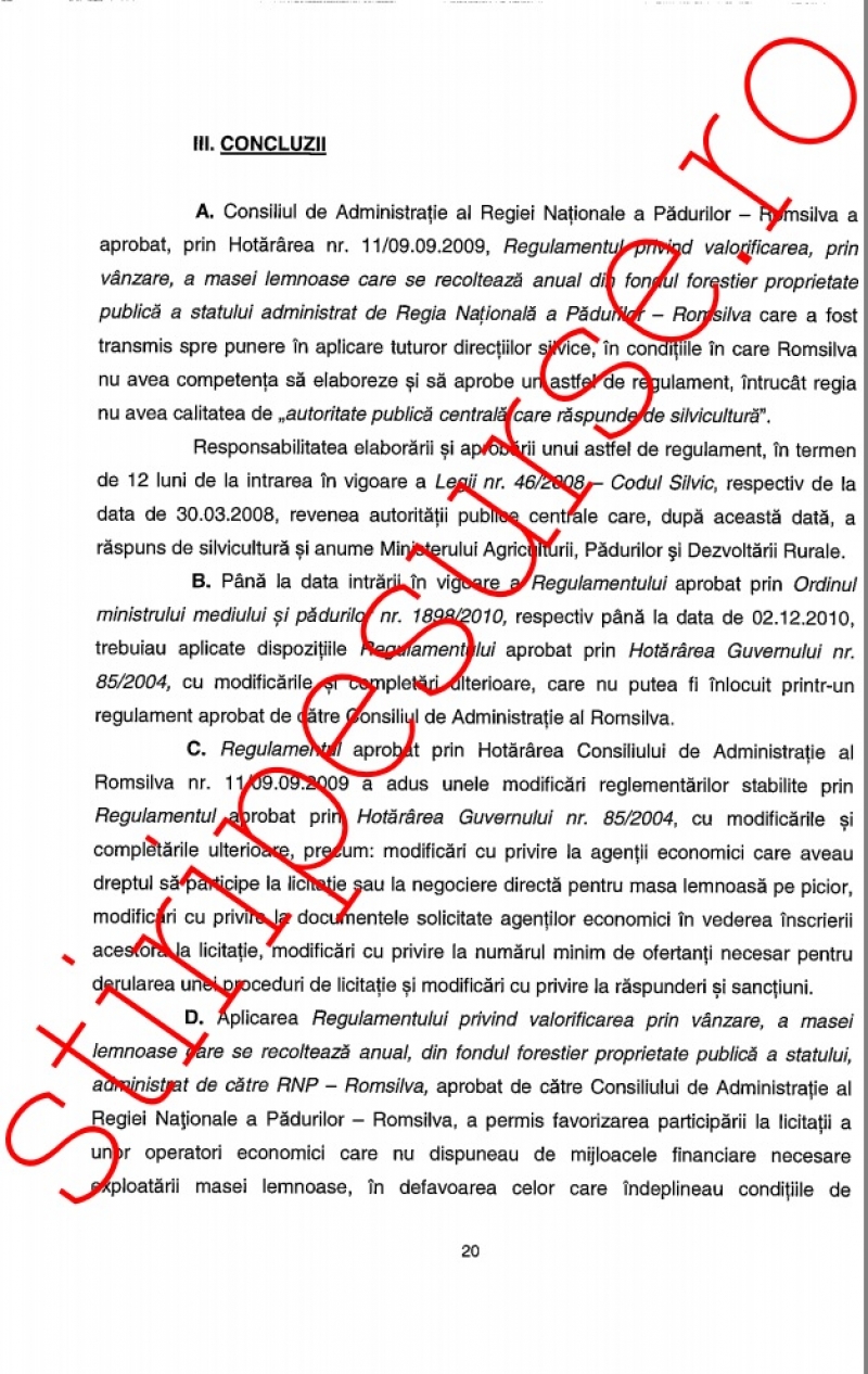 Pe scurt, Corpul de Control al premierului susţine că Romsilva a elaborat fără temei legal un regulament care a favorizat unele firme. Regulamentul respectiv, mai spune Corpul de control al premierului, a fost adoptat prin Hotărîrea nr. 11 a Consiliului de Administrație al Romsilva pe 9 septembrie 2009. Prin urmare, a decis Corpul de control, toți membrii CA al Romsilva trebuie cercetați de DNA pentru „abuz în serviciu”.