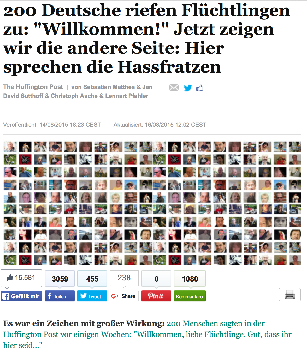 The Huffington Post, ediția de Germania, a început publicarea numelor și fotografiilor celor care publică pe facebook sau pe siteul ziarului comentarii negative la adresa migranților care au invadat Germania.