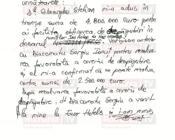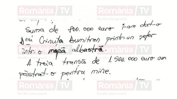 „1.000.000 doamnei Crinuţa Dumitrean în aceleaşi condiţii ca la prima descriere. 5 milioane i-am dat lui Diacomatu Sergiu, în mai multe tranşe, funcţie de cum le primeam. De la Gheorghe Stelian 1,2 milioane de euro i-am oprit eu”, a scris Cocoş.