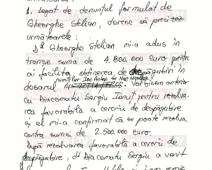În denunțul lui Dorin Cocoş, acesta scrie negru pe alb cum a împărţit milioanele primite de la Gheorghe Stelian. Parte ar fi fost duşi şi la Crinuţa Dumitrean. Când voia ca un dosar să fie rezolvat mai repede, scria doar bileţele. Milioanele erau împărţite în numerar, de multe ori cu sacoşa, potrivit romaniatv.net