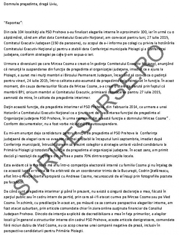 Senatorul PSD Daniel Savu, fost ofiter SRI, spune intr-o scrisoare trimisa lui Liviu Dragnea ca a cerut personal protectie de la Florian Coldea pentru doi parlamentari dupa ce fiul baronului Mircea Cosma a creat „o stare de teama”, totul petrecandu-se in contextul alegerilor pentru sefia PSD Prahova in care Daniel Savu se afla „intr-o competitie electorala interna cu familia Cosma”.