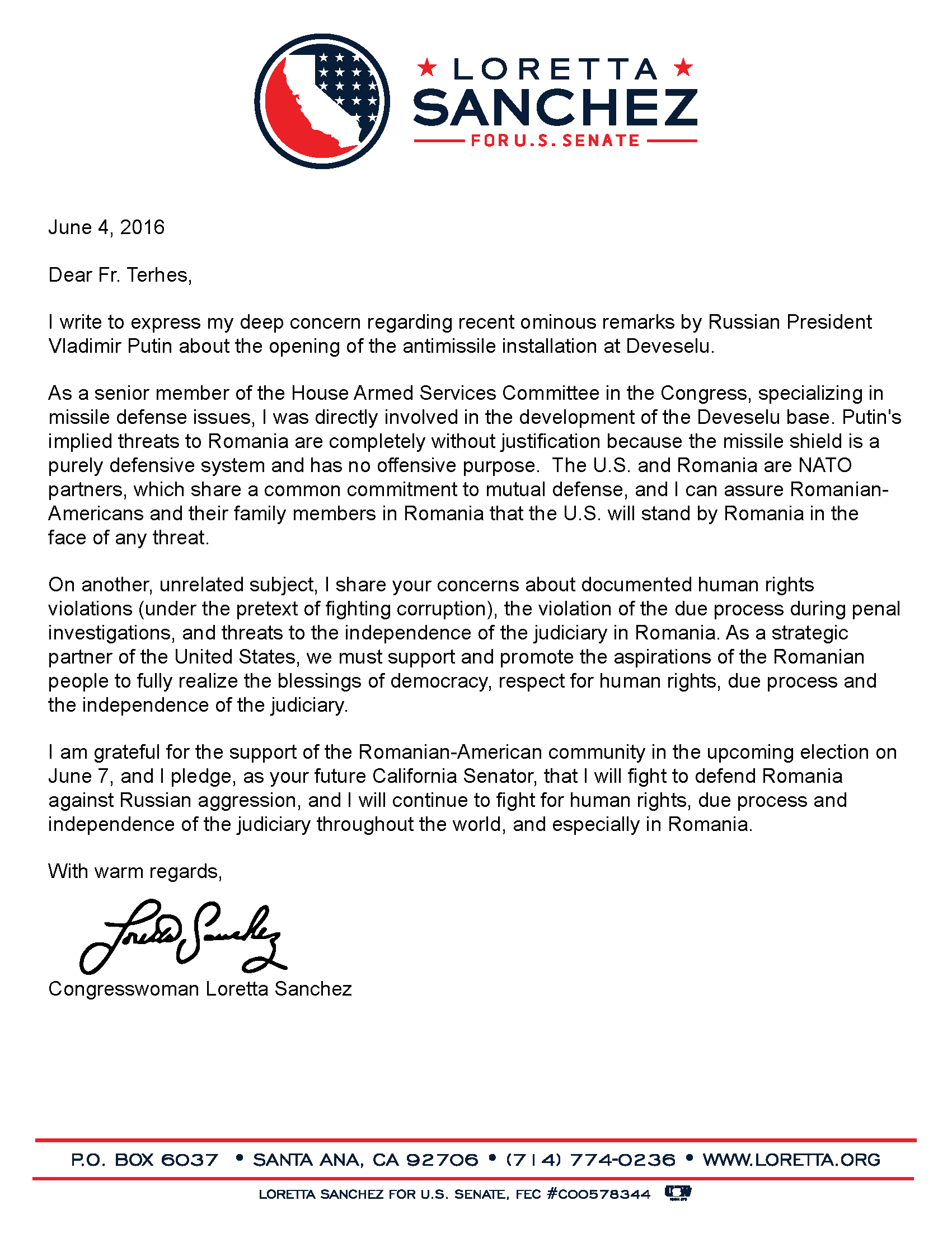 Congresmena Loretta Sanchez, co-presedinte al grupului de prietenie cu Romania din Congres si candidat pentru pozitia de senator de California, si-a exprimat ingrijorarea cu privire la „incalcarile documentate ale drepturilor omului, sub pretextul combaterii coruptiei, violarea drepturilor procesuale pe timpul anchetelor penale si amenintarile la independenta justitiei din Romania”, a spus aceasta intr-o scrisoarea transmisa Romanian Community Coalition pe data de 4 iunie 2016, informeaza flux24.ro.