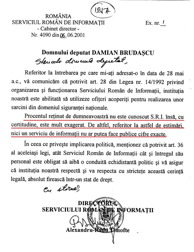 În 6 iunie 2001, Radu Timofte, șeful de atunci al Serviciului Român e de Informații, recunoștea, într-un înscris oficial, ca răspuns la o solicitare a unui parlamentar, că redacțiile din România sunt infiltrate cu ofițeri acoperiți.
