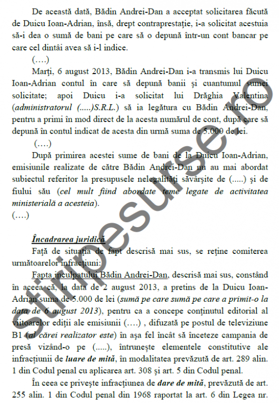 „La data de 2 august 2013 Bădin Andrei-Dan, realizator al emisiunii Aktualitatea B1, difuzată la postul de televiziune B1 TV, a pretins de la Duicu Ioan-Adrian suma de 5.000 de lei (sumă pe care a primit-o la data de 6 august 2013), pentru ca a concepe conţinutul editorial al viitoarelor ediţii ale emisiunii al cărei realizator este în aşa fel încât să înceteze campania de presă, pe care tot el o iniţiase, vizând-o pe Plumb Rovana (preşedinta Organizaţiei de Femei a Partidului Social Democrat şi, la acel moment, ministru al Mediului şi Schimbărilor Climatice).