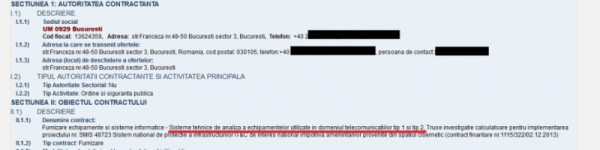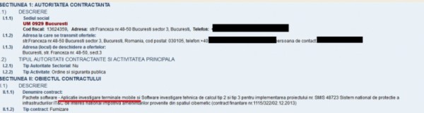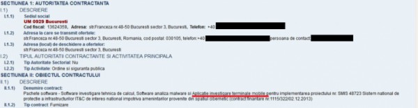Unitatea Militară 0929 a SRI, din Capitală, vrea să cumpere câteva aplicații software pentru investigarea telefoanelor mobile și a tabletelor. Printre altele, instituția își dorește un sistem de analiză capabil să extragă, din memoria terminalelor mobile, informații privind agenda telefonică, registrul de apeluri, SMS-urile primite, conturile de e-mail și parolele utilizate, ultimele pagini de internet, precum și fișiere audio, foto și video. În paralel, va putea recupera chiar și fișierele șterse sau protejate.