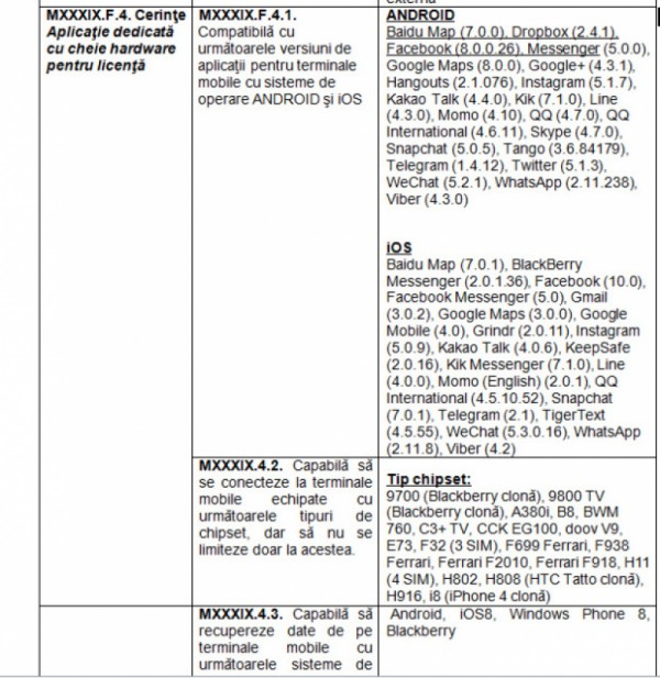 Mai mult, programul se va putea conecta la terminalele echipate cu procesoarele „9700 (Blackberry clonă), 9800 TV (Blackberry clonă), BWM 760, F699 Ferrari, F938 Ferrari, Ferrari F2010, Ferrari F918, H808 (HTC Tatto clonă), i8 (iPhone 4 clonă)”, însă nu se va limita la acestea, potrivit aceluiași document. Datele din telefoanele și tabletele “suspecte” vor putea fi exportate în rapoarte de tip document, compatibile Microsoft Office.