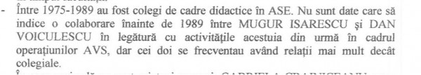 – Între 1975-1989 au fost colegi de cadre didactice în ASE. Nu sunt date care să indice o colaborare înainte de 1989 între MUGUR ISĂRESCU şi DAN VOICULESCU în legăturâ cu activităţile acestuia din urmă în cadrul operatiunilor AVS, dar cei doi se frecventau având relaţii mai mult decât colegiale.