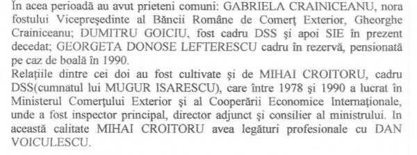 Relaţiile dintre cei doi au fost cultivate şi de MIHAI CROiTORU, cadru DSS (cumnatul lui MUGUR ISĂRESCU), care între 1978 şi 1990 a lucrat în Ministerul Comerţului Exterior şi al Cooperării Economice Intemaţionale, unde a fost inspector principal, director adjunct şi consilier aI ministrului. În această calitate MIHAI CROITORU avea legături profesionale cu DAN VOICULESCU.