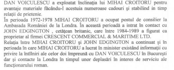 – DAN VOICULESCU a exploatat inclinaţia lui MIHAI CROITORU pentru avantaje materiale făcându-i acestuia numeroase cadouri şi stabilind în timp relaţii de prietenie. În perioada 1972-1978, MIHAI CROITORU a ocupat postul de consilier la Ambasada României de la Londra. În aceastâ perioada a intrat în contact cu JOHN EDGINGTON, cetătean bfitanic, care între 1984-1989 a figurat ca proprietar al firmei CRESCENT COMMERCIAL & MARITIME LTD.