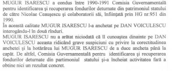 MUGUR ISĂRESCU nu a arătat niciodată că îl cunoaştea dinainte pe DAN VOICULESCU aceasta ridicând grave suspiciuni cu privire la corectitudinea anchetei şî la hotărârea lui MUGUR ISARESCU de a duce ancheta până capăt.De altfel, Comisia Guvernamentală pentru identificarea şi recuperarea fondurilor deturnate din patrimoniul statului şi-a incheiat activitatea fară a obtine nici un rezultat concret.