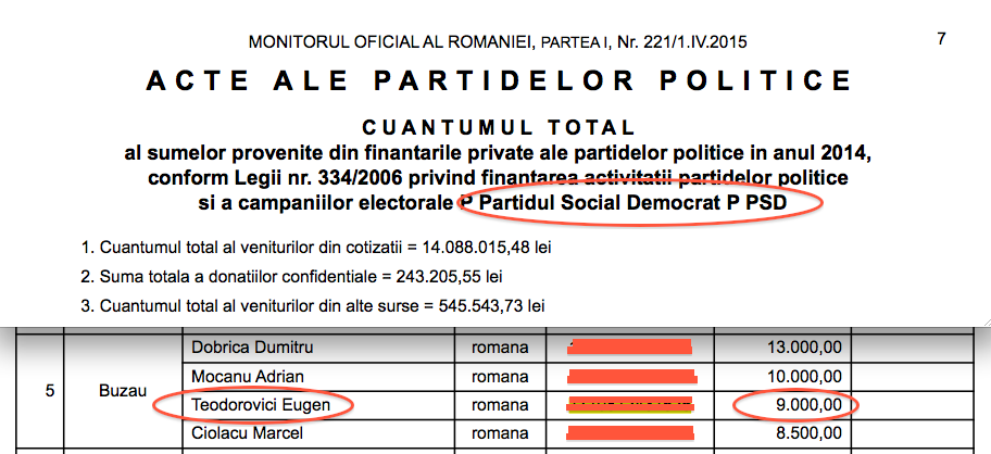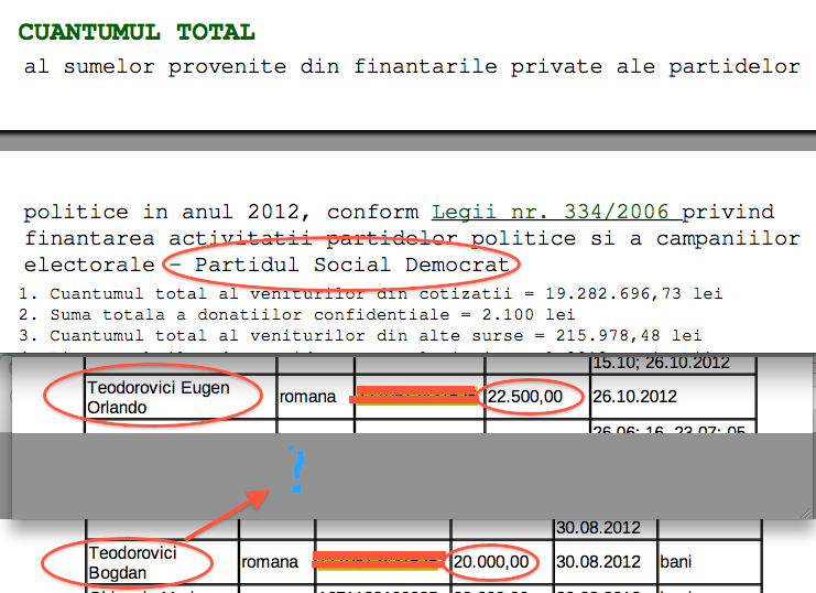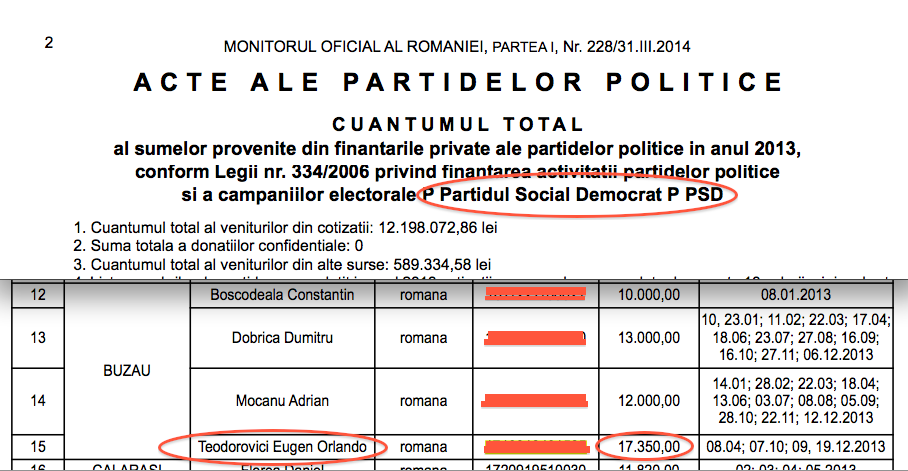 Astfel, Teodorovici a finanțat PSD în 2012 cu 42.500 RON, în două tranșe. Curios este că 20.000 RON au fost donați sub un prenume fals, “Bogdan”, dar CNP-ul este cel al lui Eugen Orlando Teodorovici.