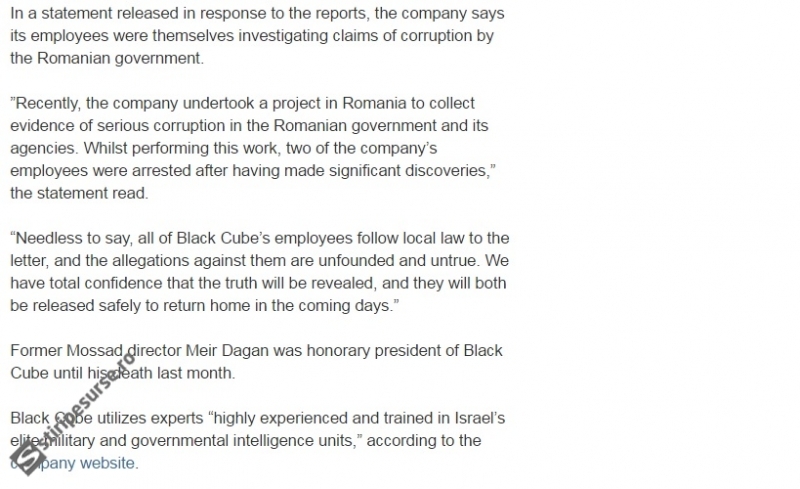 ”Recent, compania a efectuat un proiect pentru a strânge date despre corupție mare în rândul guvernului român și agențiilor sale. În timp ce făceau asta, doi dintre angajații companiei au fost arestați după ce au făcut descoperiri impresionante de corupție”, se arată în comunicatul Black Cube.
