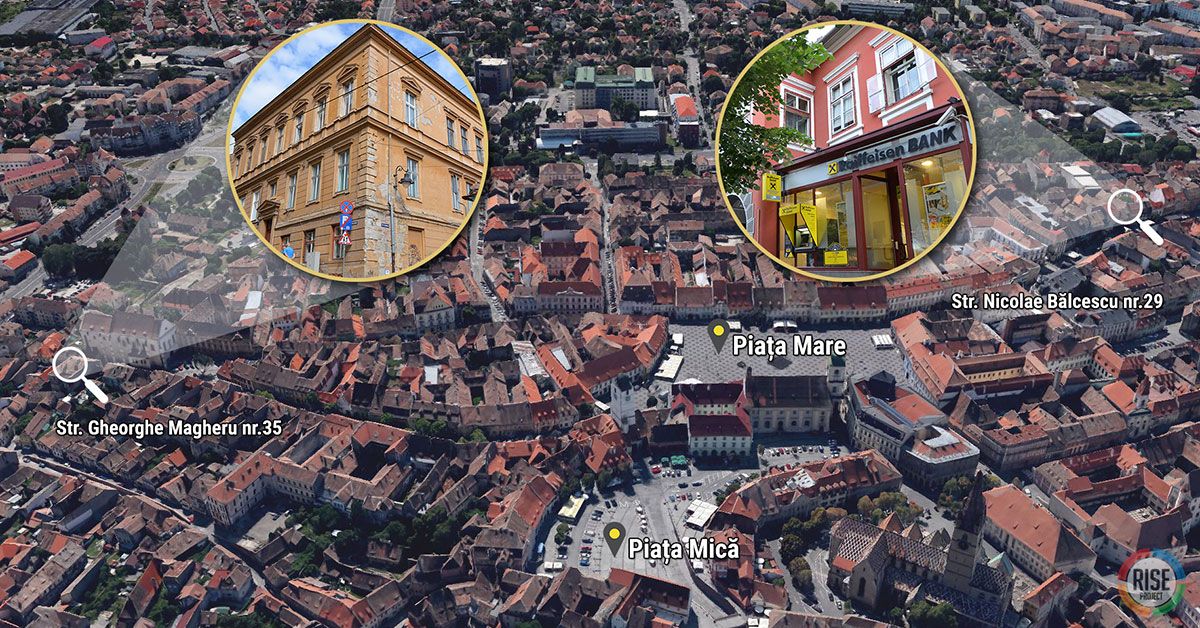 Cele două case pe care Eliseu Ghenea le-a deținut, până în anii 1960, în centrul Sibiului. După 1999, acestea au intrat în posesia familiilor Iohannis și Baștea. FOTO: Google Earth, RISE Project. / INFOGRAFIE: Sergiu Brega