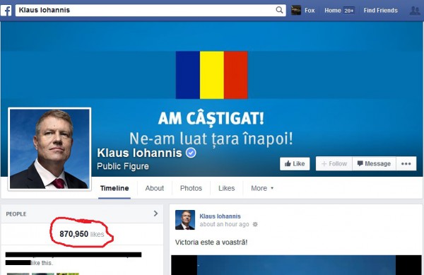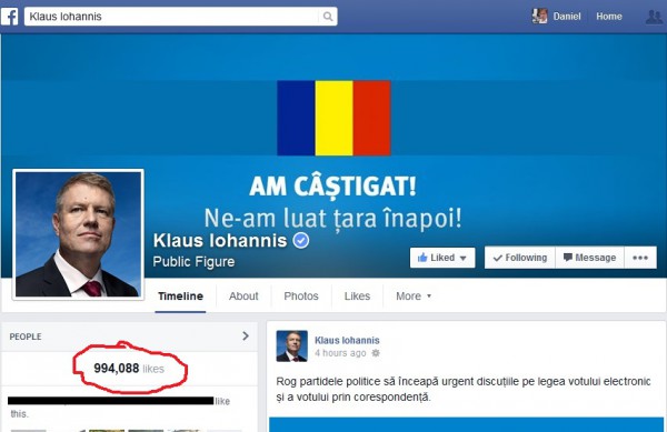 Duminică, la scurt timp după închiderea urnelor și anunțul victoriei, pagina lui Iohannis avea 871,000 de like-uri. Extraordinar este că luni seara, doar 24 de ore mai târziu, pagina de Facebook a viitorului președinte al României avea 994,088 de like-uri și că nu a avut nevoie decât de încă 12 ore pentru a atinge pragul de un milion.