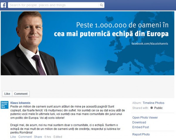 Userul de Facebook, Rally Drifter a postat un mesaj în care dădea mai multe detalii despre performanța lui Iohannis: „Klaus Iohannis a devenit primul politician european de pe Facebook ce a atins pragul de 1 milion de like-uri. Potrivit fanpagelist, el este în Top 15 printre politicienii lumii, și în Top 3 printre politicienii din afara Americii. El a întrecut politicieni Europeni de top ca Angela Merkel (898,444 like-uri), Nicolas Sarkozy (992,609 like-uri), Francois Hollande (516,967 like-uri), David Cameron, Silvio Berlusconi, Jean-Claude Junker, Jose Manuel Barroso, Tony Blair, etc. și este chiar înaintea oficialilor americani Joe Biden și John McCain… La începutul campaniei Klaus Iohannis avea câteva zeci de mii de like-uri, dar marți dimineața, pe data de 18.11.2014, el depășea pragul de un milion (n.r – de like-uri), înaintea lui Sarkozy și astfel a devenit, cum am menționat mai devreme, primul politician european cu un milion de like-uri.”.