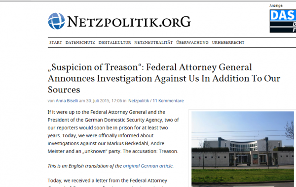 Site-ul online Netzpolitik.org a anunţat că unul dintre jurnalişti săi împreună cu editorul site-ului vor fi anchetaţi în legătură cu publicarea a două articole potrivit cărora serviciul de informaţii interne german solicită finanţări suplimentare pentru a crea o unitate specială care să monitorizeze mediile online sociale, relatează corespondenţii BBC.