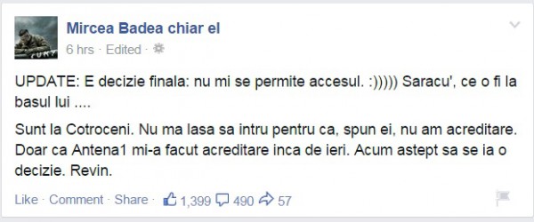 „Jurnalistul” Mircea Badea – iar ghilimelele sunt cât se poate de justificate – n-a fost primit astăzi la Cotroceni, la conferința de bilanț a președintelui Traian Băsescu la finalul celor 10 ani ai celor două mandate pe care le-a îndeplinit ca președinte al României.
