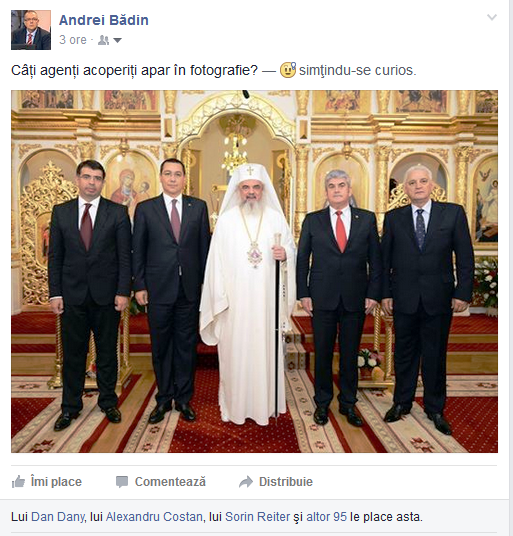 Marți seară, după dezvăluirile B1 TV că și socrul lui Victor Ponta, Ilie Sârbu, ar fi ofițer acoperit al serviciilor secrete, printre altele și în relația cu actualul Patriarh Daniel, jurnalistul Andrei Bădin a publicat o fotografie cu Ilie Sârbu, Victor Ponta, Gabriel Oprea, Patriarhul Daniel și Robert Cazanciuc cu întrebarea:Câți agenți acoperiți sunt în fotografie?